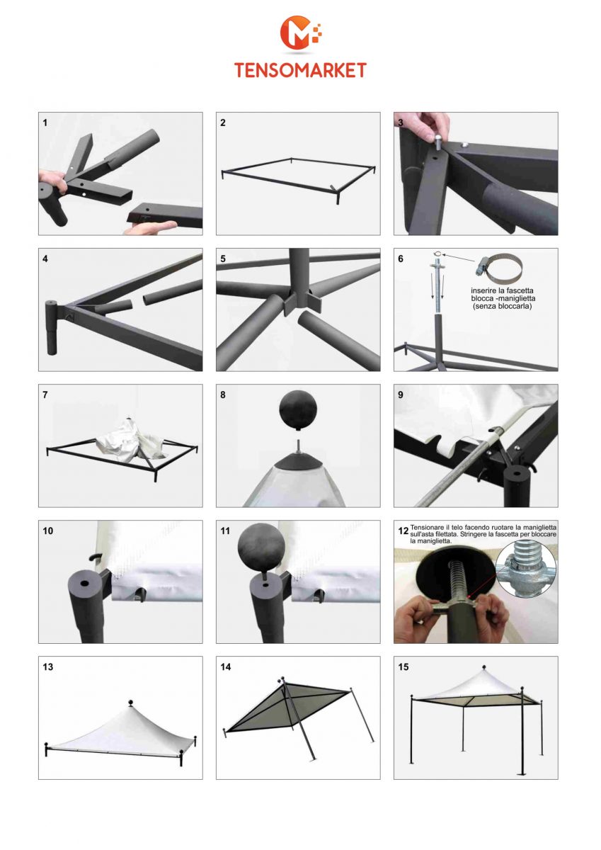Una volta installate tutte le parti, una pratica maniglia consentirà di tensionare il telo, garantendo una copertura solida. I giunti angolari, appositamente studiati, sono in grado di tenere in forma perfetta la struttura, assicurando un riparo in totale sicurezza.